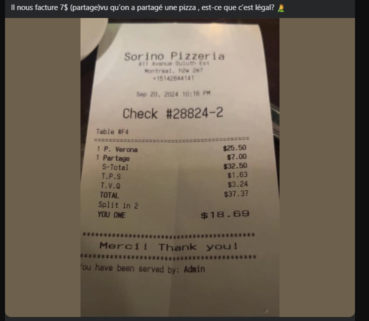 Certains ont souligné que le frais de partage était indiqué sur le menu. Et alors ? Ce n’est pas l’absence de transparence qui choque, c’est le principe lui-même. Afficher un abus ne le rend pas moins abusif. Écrire « frais de partage : 7 $ » ne transforme pas la mesquinerie en vertu commerciale. Ce n’est pas parce que c’est visible que c’est légitime. Ce n’est pas parce que c’est légal que c’est moral.